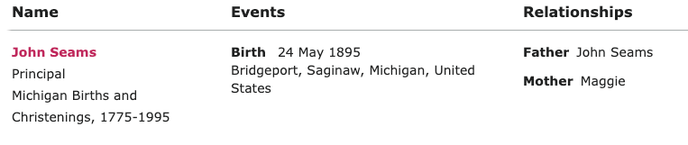 Even though this is accurate to what I’ve found in other records, the search returns no results! When this happens, it’s best to remove some information to increase the chance your search will return something. I like to start with location. Instead of Bridgeport, I will enter Saginaw (the county in which Bridgeport resides). The record I’m looking for is now the first result: