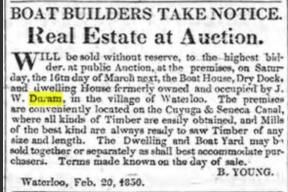 According to his headstone and census records, Joseph W. Duram was born on 18 August 1798 in the state of New York. He can first be found in the town of Mentz, where he and his wife Minerva, daughter of Seth Higley, sold their land to Archibald Wilson in 1822. The family is still in Mentz in the 1830 census. We pick them up again in the town of Waterloo, where in spring of 1833 Joseph advertises in the paper for 50 men to work at the dry dock in Waterloo. He is also selling a canal boat. Later in 1833 he also purchased the saw mill with Ebenezer Metcalf from the heirs of Elisha Williams. This venture failed, and a sheriff’s sale of his and Metcalf’s land commenced in the fall of 1837. His daughter Nancy had married David Hamell the previous year. He further petitioned for bankruptcy in Auburn in March of 1843. He was also elected constable that year. He appears to have repurchased the boatyard he advertised for in 1833 again in 1845. His wife Minerva died of apoplexy (stroke) at 48 years old on 23 November 1847. He remarried the following year to Mary Himelberger. He continued to fail in his business ventures, and the boatyard where he built boats with his family was auctioned off in 1850. The continued strain of these business failures may have contributed to the family’s decision to move west to Michigan, approximately in 1853 (though he was purchasing land in preparation by 1848). By his headstone, Joseph died on 6 October 1857 in Michigan at the age of 59.