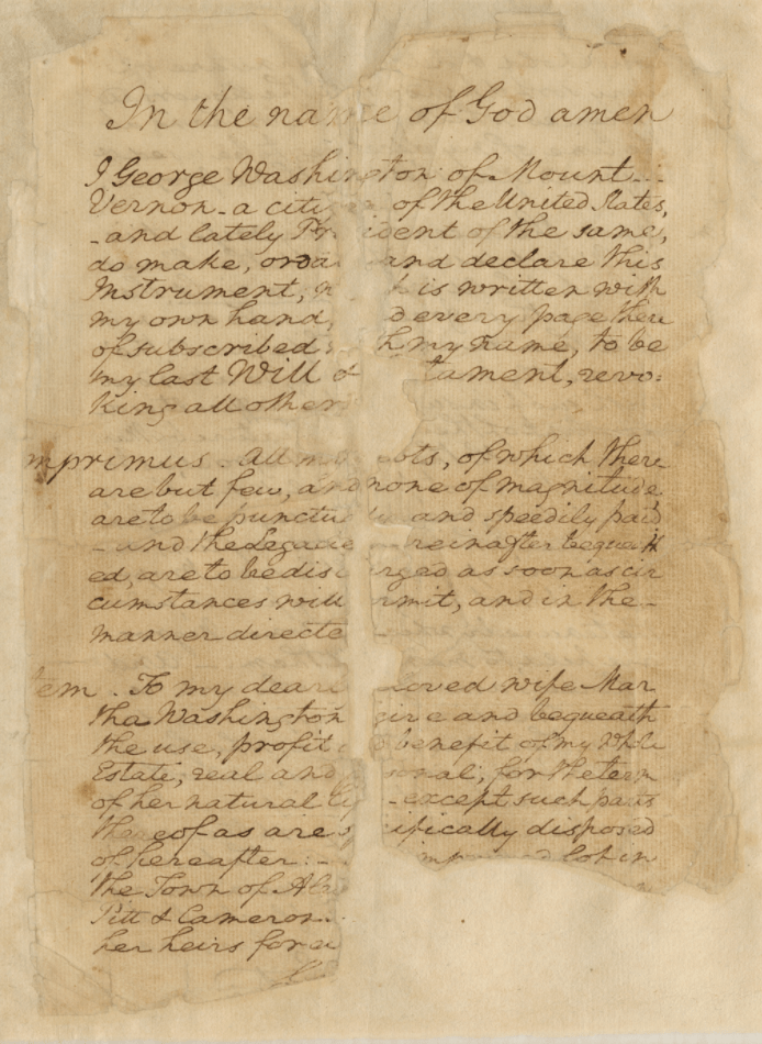 George Washington’s family story in the U.S. began in 1656, when his great grandfather John Washington emigrated from Sulgrave in Northamptonshire, England to the colony of Virginia. Most of us know well the story of Washington, so rather than going into this I thought it’d be more fun to look at some records! Here are two. On the left is a land grant of 5,000 acres to John Washington from 1674. On the right, George Washington’s will, probated on 20 January 1800 at Fairfax.