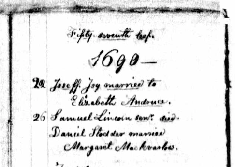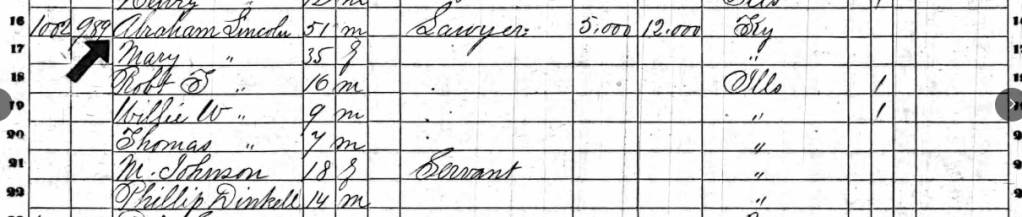 Abraham Lincoln’s story began early in our country’s history too, as he was descended from Puritan weaver Samuel Lincoln, who came to the Massachusetts Bay Colony in 1637. As with Washington, Lincoln’s life is well-documented and easy to find and read about, so below are two interesting records. On the top is Samuel Lincoln’s death record entry in May 1690. On the bottom, Abraham Lincoln’s family’s 1860 census entry in Springfield, Illinois.